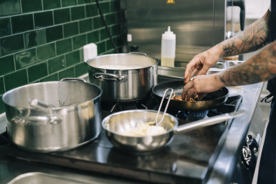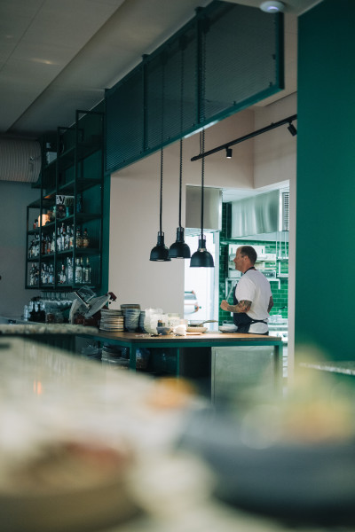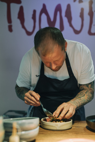 Ett tag trodde han att han aldrig skulle stå i ett restaurangkök igen. Orken var slut och han såg ingen glädje i det längre. Nu gnistrar det i ögonen på nytt. Lusten och drivet tillbaka. Framför allt verkar han lycklig.– Innan försökte jag förverkliga mig själv genom att laga mat för andra kockar och matskribenter. Det struntar jag i nu. De får tycka vad de vill. Jag vet att det finns folk som kommer in här bara för att äta våra kycklingvingar och det räcker för mig. Jag behöver inte längre gå in i minsta detalj i allting, utan kan slappna av mer.Medan Restaurang Östergatan och inte minst Villa Strandvägen handlade mer om fine dining, är Tumült på regementsområdet i Ystad den gästvänliga kvarterskrogen där alla är välkomna – även småbarn och hundar.Under sommaren har både Daniels fru och hans två tonårssöner jobbat på restaurangen och han tycker om att känna att det på så sätt blir ett familjeprojekt.– Då känns det inte som ett jobb längre.Daniel ville inte sätta sitt eget namn på den nya krogen. I stället fick det bli något som tydligt signalerar vad verksamheten står för.Inredningen går i tonerna grönt och rosa och längs ena väggen har den rosa färgen droppat och runnit ner nästan som blod, som om det verkligen har gått hett till där inne vid något tillfälle. Loggan är lika brokig och ostrukturerad som det kaosartade namnet antyder.Idén att sätta prickar över det ena u:et kläckte Daniel och hans fru. Det tyska ü:et finns ju i deras efternamn. De ser det också som ett kul sätt att leka med krogens namn. Ü kan klämmas in lite varstans, till och med i Ystad (Üstad).Att bokstaven dessutom får formen av två ögon och en leende mun blir även det en talande symbol för verksamheten. Det här ska vara en krog med högt i tak, ett tak som man gärna får slå klackarna i. På sin hemsida skriver krogen om härligt sorl och myller, eller snarare ”müller”, som ju blir en dubbelbottnad ordlek.– Det får gärna vara lite stökigt, med dans på borden, säger Daniel och ler brett.På Tumült behövs ingen tjock plånbok för att slå sig ner. På menyn står många smårätter, möjliga att äta var för sig eller allra helst i kombination.När Daniel beskriver maten använder han ord som ”guilty pleasure” och ”comfort food”. Det är måltider med tryck i smakerna. Kanske är det inte alltid så nyttigt, medger han, men det är inte meningen heller.Det går också utmärkt att bara slinka in på ett glas vin eller en öl. Den långa bardisken är ett medvetet sätt att skapa god stämning i lokalen. Där kan man sitta med full insyn rakt in i köket och snacka med personalen. På Tumült kan man hänga, trivas och umgås.– Under sommaren har vi haft fullt varenda kväll. Eftersom jag är här så mycket känner jag igen många gäster och det finns folk som har varit här 15 gånger. De har också börjat hitta sina favoritplatser i lokalen. Det var precis så jag ville ha det. Jag älskar stamgäster!TEXT: Johan Bentzel | FOTO: Rebecca Wallin