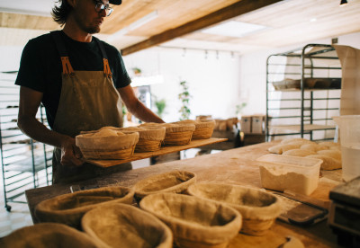 Under samtalet jobbar han vant med en stor surdeg som har fått jäsa i några timmar och nu delas upp i 21 mindre delar för fortsatt jäsning i enskilda korgar.