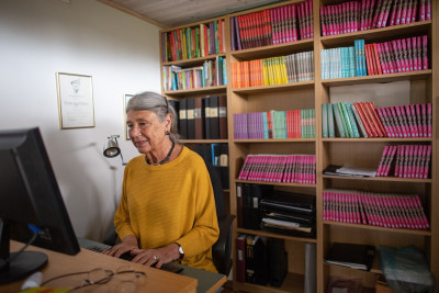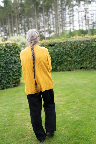Med blicken vänd ut mot tomten sitter hon på en mörk trästol med snirkligt utsnidade mönster, alltid med tända stearinljus på bordet. I ögonvrån kan hon skymta en imponerande byst, föreställande ett kvinnoansikte, som hon har ropat in på auktion och placerat vid fönstret precis där den öppna planlösningen glider över från kök till vardagsrum.