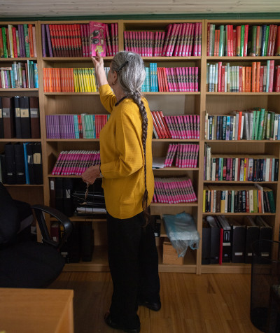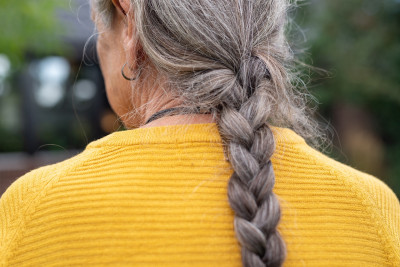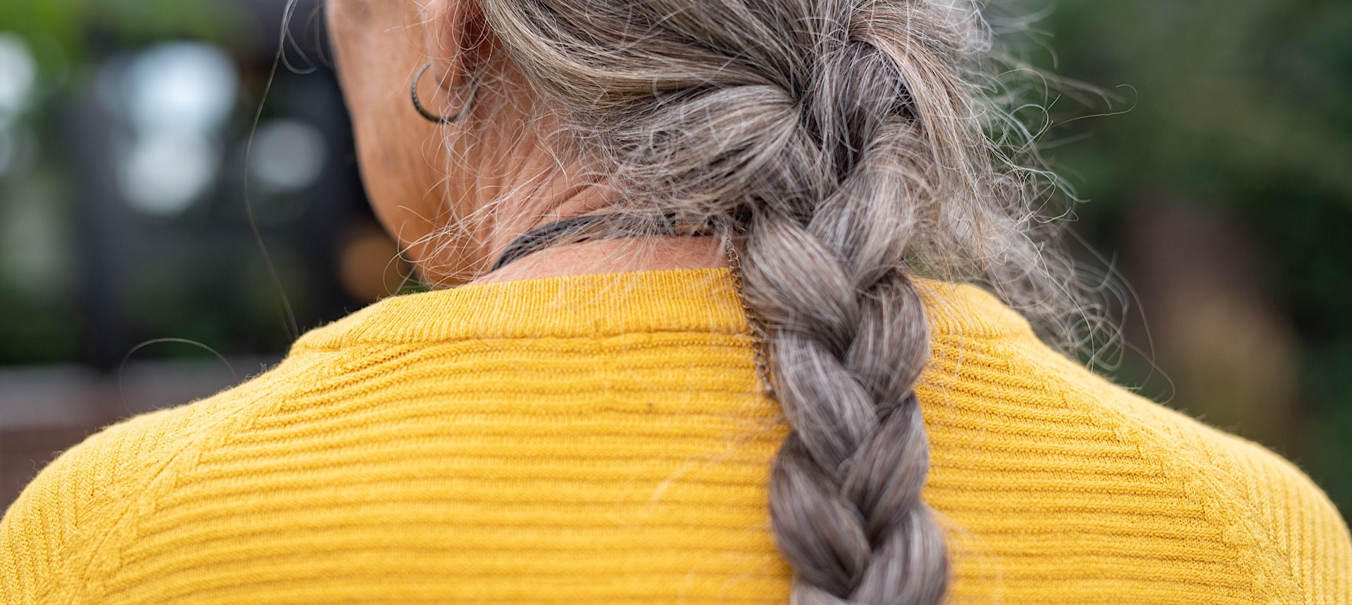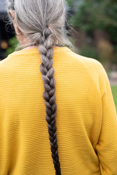 När jag fick barn klippte jag av den helt, men då tyckte jag att jag tappade min identitet. Sedan är det ju bekvämt också: det kan både regna och blåsa, den är där den är ändå. Flätan hänger alltid på ryggen, utom då fotografer kommer, för då vill de ha den fram. När jag släpper ut håret når det mig till knäna. Jag tvättar det i badkaret. Det gäller att se upp när det slörpar till, så det inte dras med ner i avloppet.