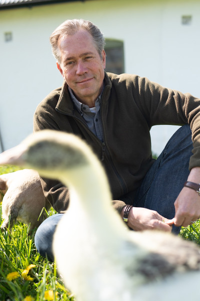 Längs grusvägen tultar den tre veckor gamla gässlingen Jonas, som har vuxit så snabbt att han själv inte riktigt verkar ha hängt med. Strax intill bräker de nyfikna getterna.